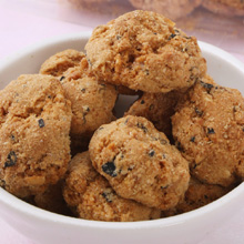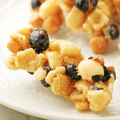 黒豆やピーナッツ、あられなどを少量の水飴で固めた豆菓子です。鳥のつくねをまねて、ひとつひとつ丁寧に握ってつくりました。